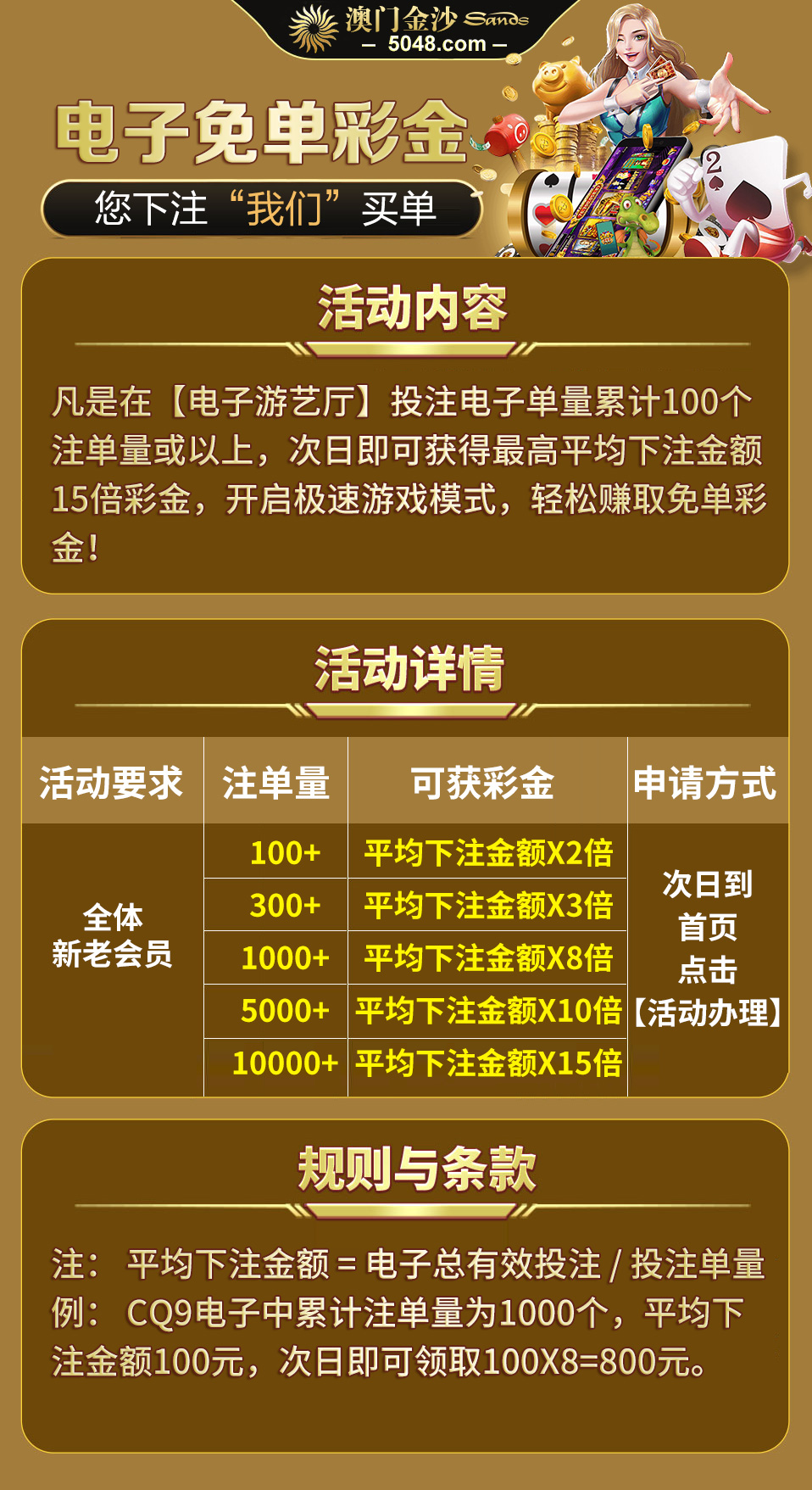 如:电子总有效投注¥1000万x0.5%=50000元佣金;